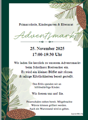 News Neuigkeiten, Aktuelles und Berichte der vielfältigen Aktivitäten der Schule Pfungen. Adventsmarkt11. November 2025Skillspark 202515. Oktober 2025Evaluationsbericht Schule Pfungen Schuljahr 2024/202514. August 2025Wasserqualität der Töss12. August 2025Schulverwaltung: Öffnungszeiten Sommerferien12. August 2025Street Heroes – die «Grossen» helfen den «Kleinen»8. Januar 2025Der Kindergarten singt für ältere Menschen18. Dezember 2024Bandkonzert Sek16. Dezember 2024Adventssingen 24 – Primarschule16. Dezember 2024Tierspuren lesen- Draussenlernen November 2428. November 2024Exkursion Thurauen27. September 2024Willkommen an der Schule Pfungen17. August 2023